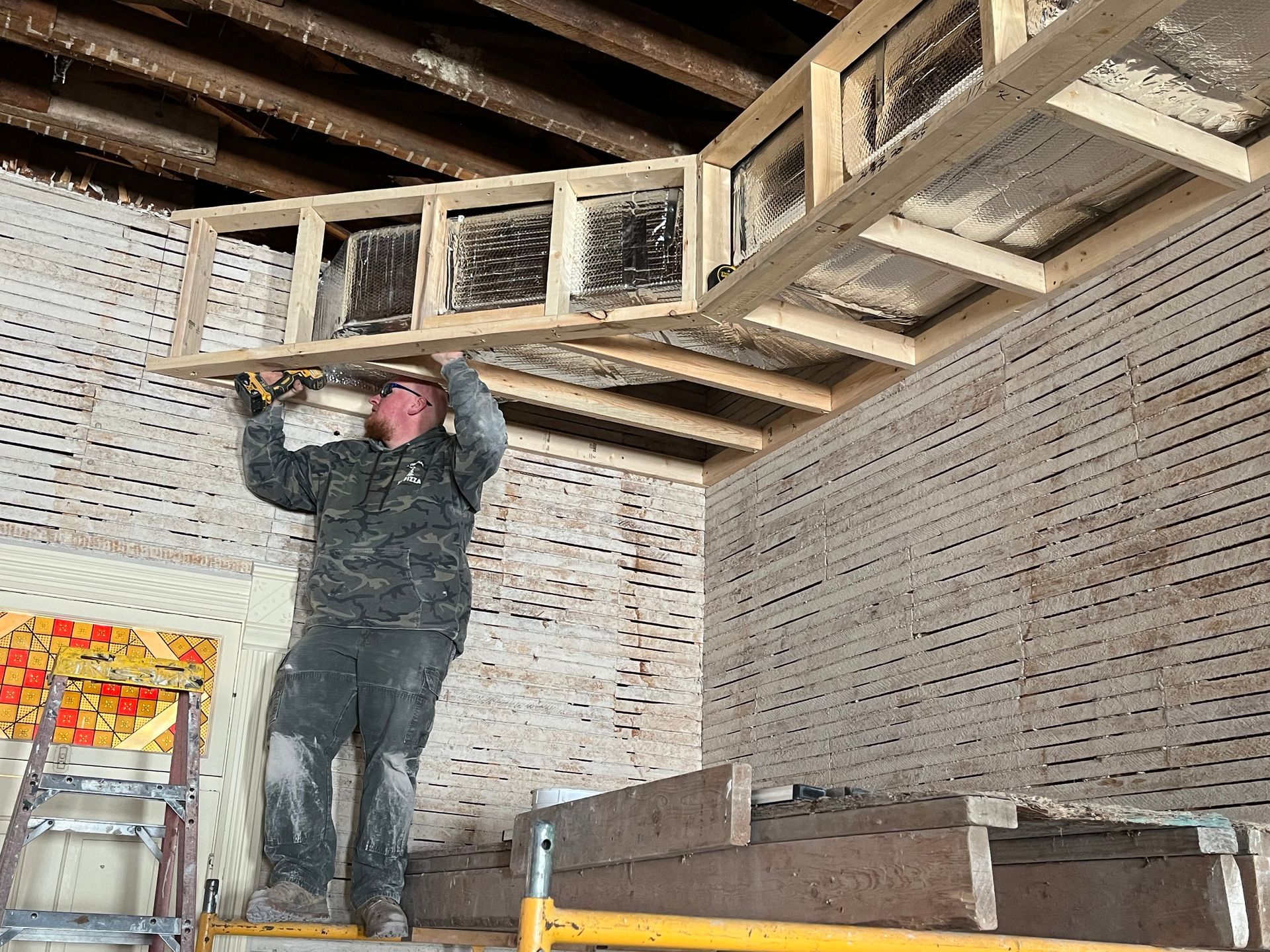 Dustin Bilden of Warren Baker Construction works on framing around the duct work on both sides of the interior wall which separates the 2 large rooms. The HVAC system has been installed by NE Iowa Mechanical.