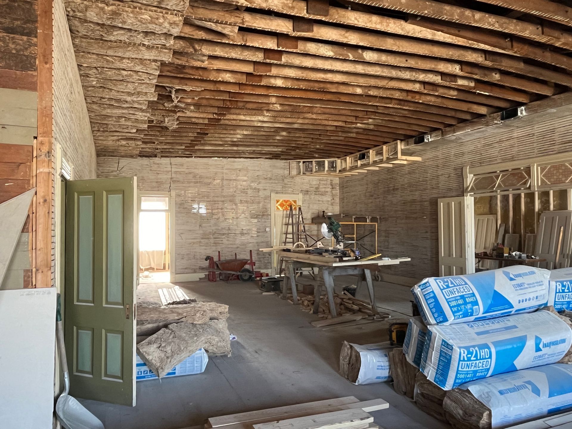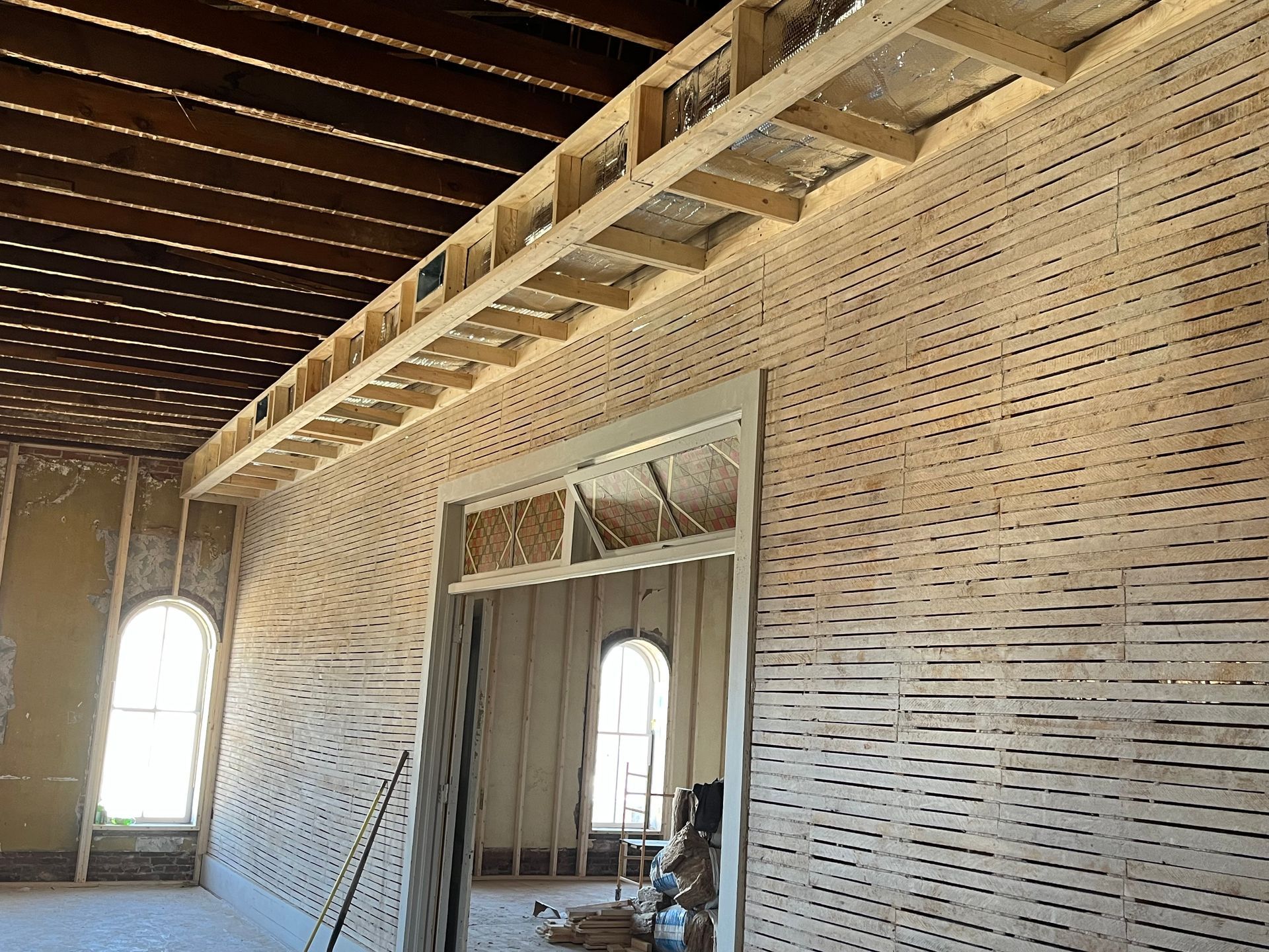 Exterior walls are being studded out in order to insulate and facilitate wiring. Note the gentle curve of the ceiling trusses, which extends over the entire space.