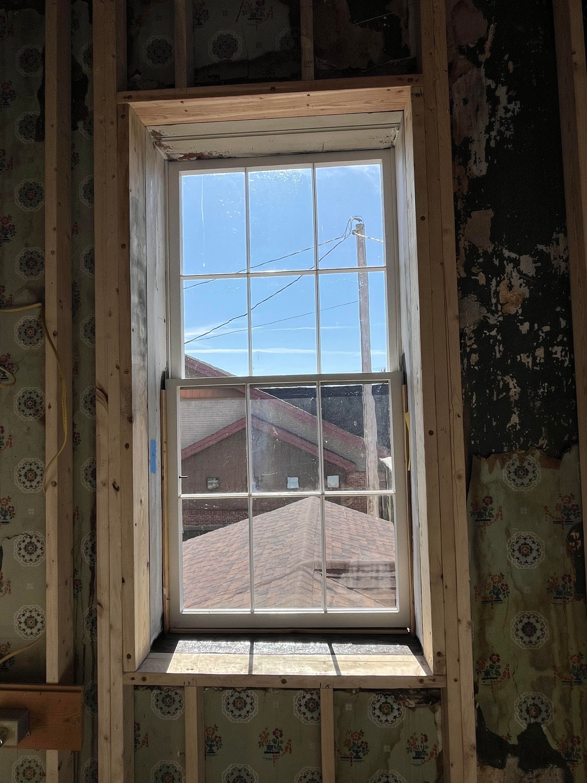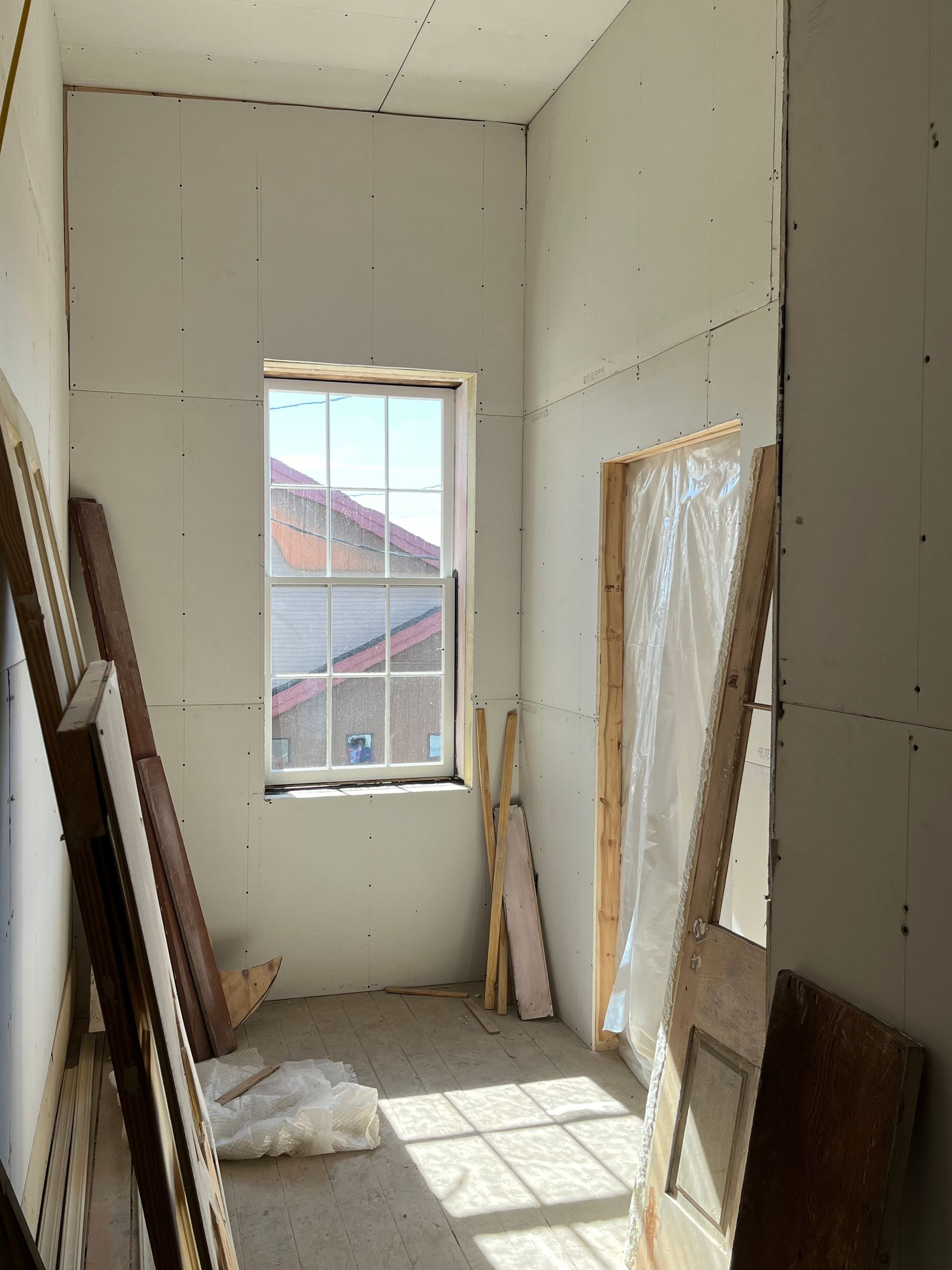 Framing around duct work on the park side room. Sheetrock will be installed on the frame and also over the exposed lath of the interior walls.