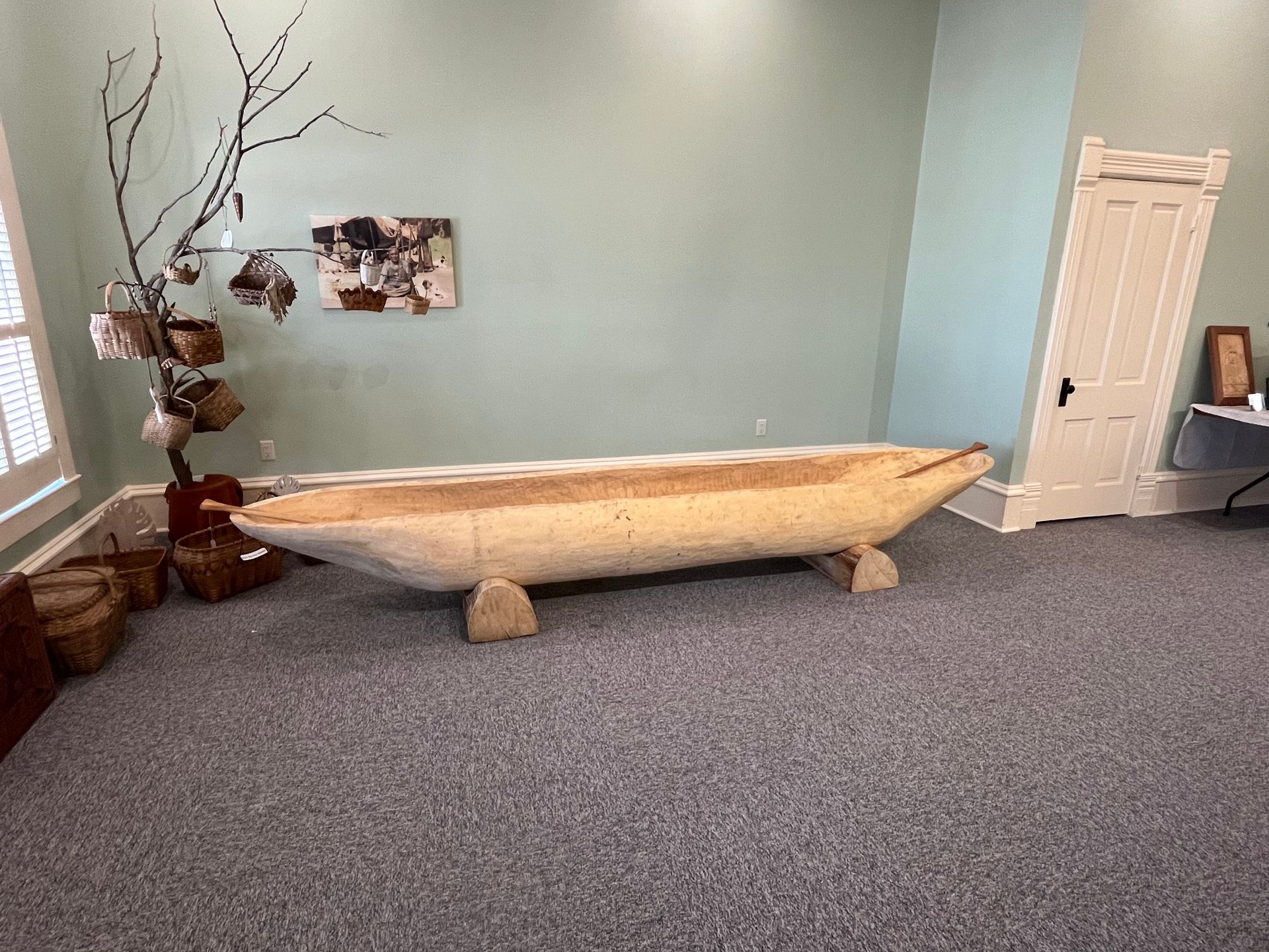 October 18, 2025 was the highly anticipated moving day for the dugout canoe, which will be a part of the Transportation Exhibit of the Tribes of the Turkey River Interpretive Center. The canoe was crafted by Louis Christen of rural Elgin and is in the style of what the Indigenous people of our area would have made and used. It was made out of a cottonwood log and is 12.5 ft long. The paddles were also made by Louis, with one being red oak and the other of white ash. As can be seen in the photos, our EHS Senior Moving Crew managed to bring it in though one of the south windows with some mechanical tractor assist. Thanks to all that helped make this wonderful exhibit possible and with a special THANK YOU to Louis for his work and talent in making this possible.