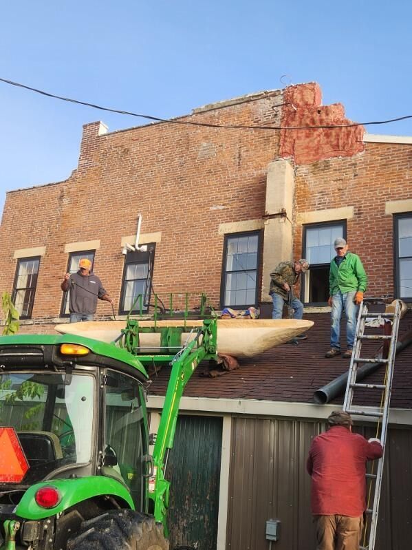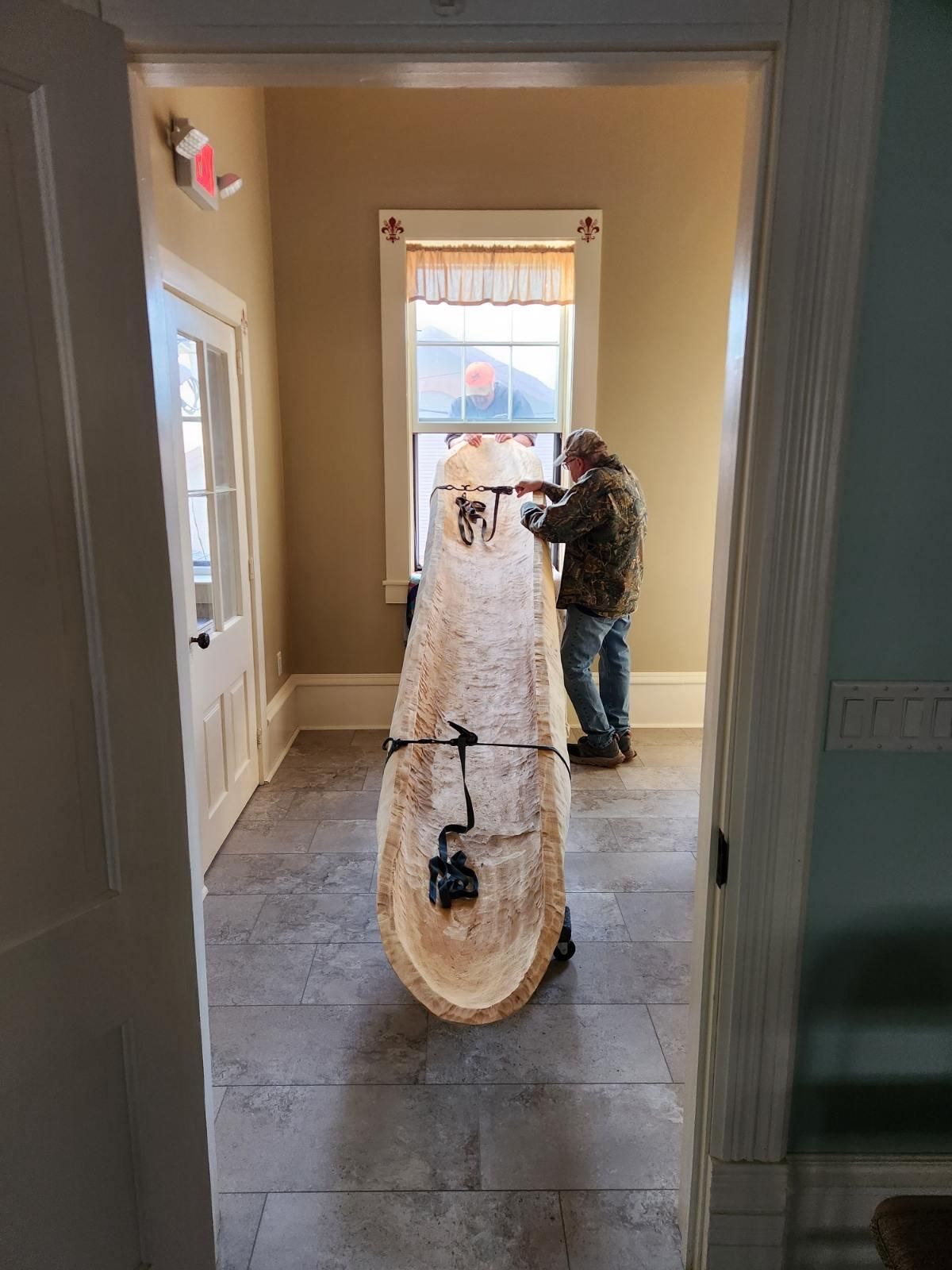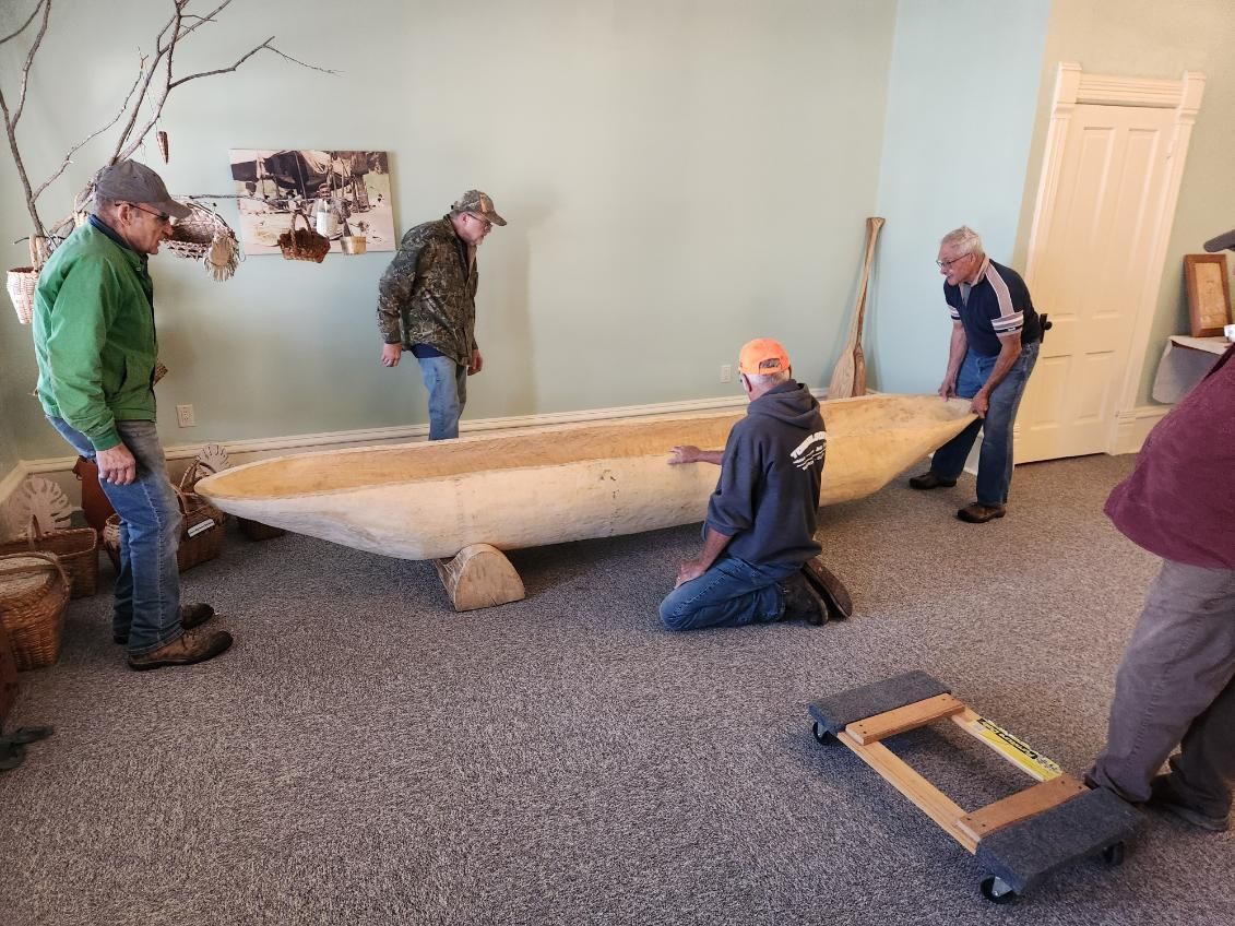 October 18, 2025 was the highly anticipated moving day for the dugout canoe, which will be a part of the Transportation Exhibit of the Tribes of the Turkey River Interpretive Center. The canoe was crafted by Louis Christen of rural Elgin and is in the style of what the Indigenous people of our area would have made and used. It was made out of a cottonwood log and is 12.5 ft long. The paddles were also made by Louis, with one being red oak and the other of white ash. As can be seen in the photos, our EHS Senior Moving Crew managed to bring it in though one of the south windows with some mechanical tractor assist. Thanks to all that helped make this wonderful exhibit possible and with a special THANK YOU to Louis for his work and talent in making this possible.